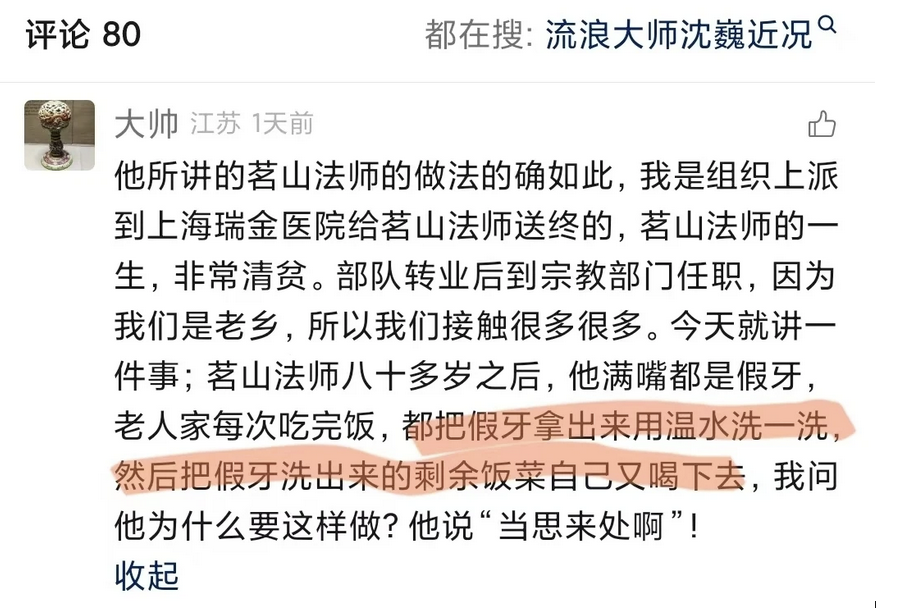 又看到一条评论茗山每次吃完饭,都要把假牙拿出来洗一洗,再把洗假牙的水喝下去,只因“假牙缝里也可能有粮食”。